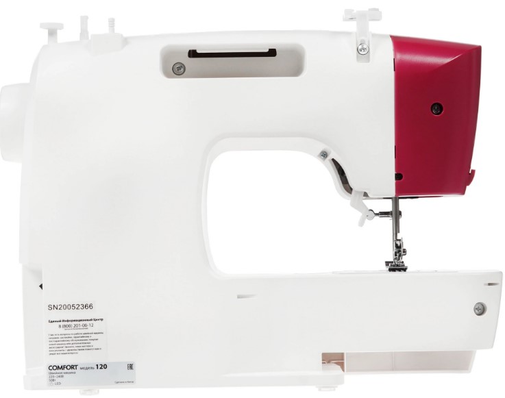 Прибор Comfort 120 выполняет петли в полуавтоматическом режиме, а также проводит 19 различных операций. В их числе осуществление оверлочной и потайной строчки. Машинка поставляется в плотном чехле вместе с набором игл и шпулек, распарывателем, отверткой и рамкой для полуавтоматической петли. Устройство весит 5 кг и обладает размерами 41x32x16 см.