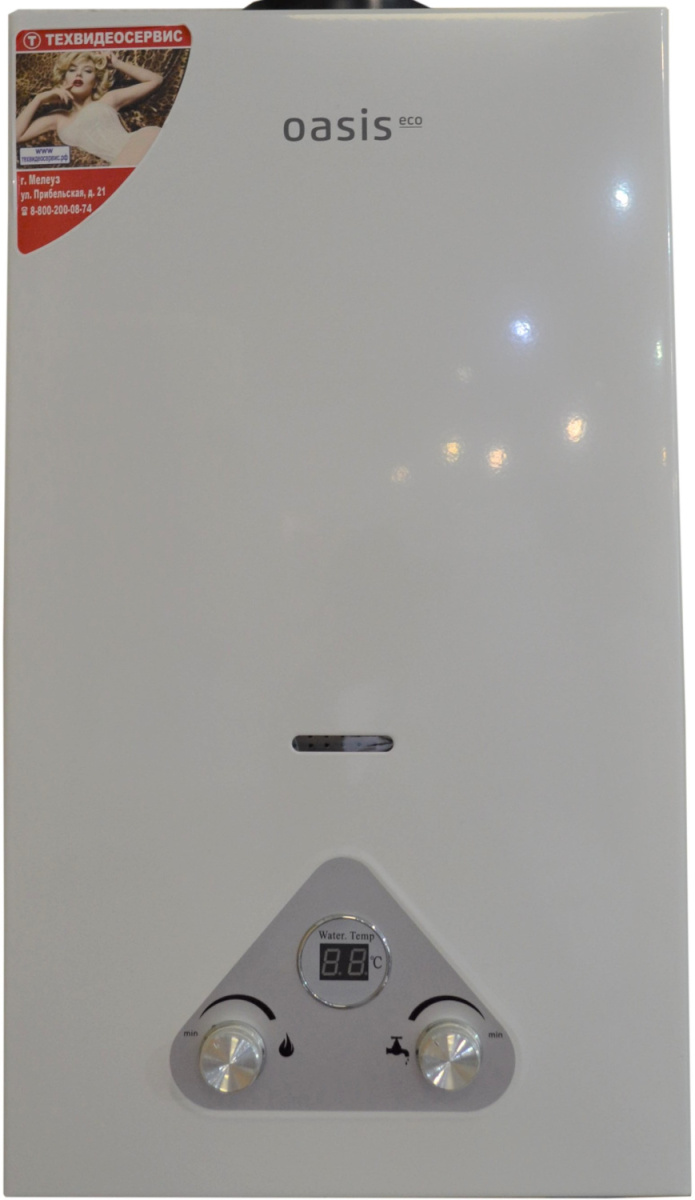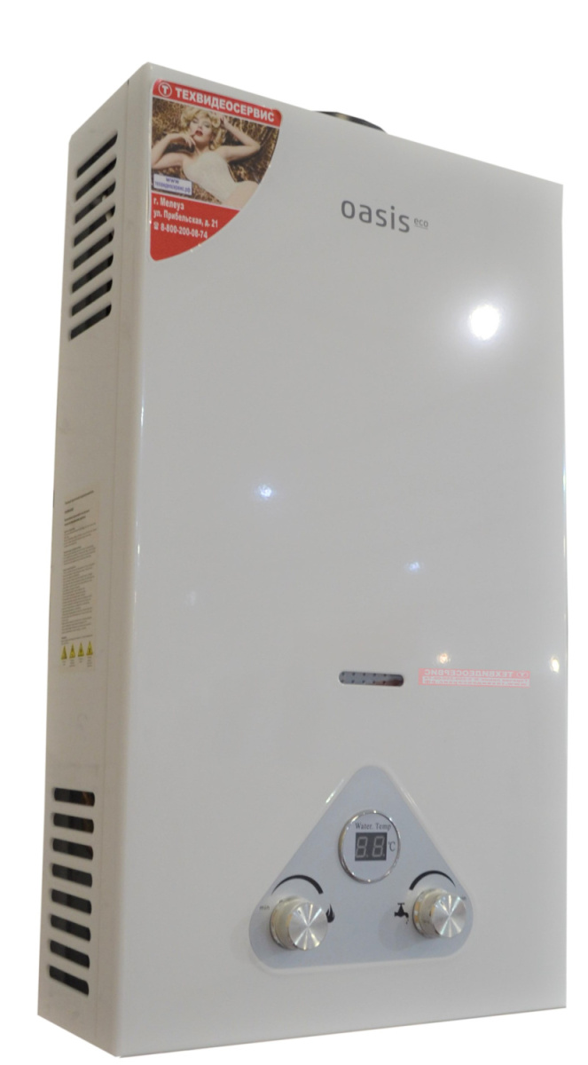 Газовый проточный водонагреватель Oasis Eco W-20, выпускавшийся ранее под брендом Zerten - наиболее удобный и дешевый источник горячего водоснабжения в условиях отсутствия централизованного. При открытии крана происходит автоматический поджиг газовой колонки, вода из водопровода попадает на теплообменник и моментально нагревается до необходимой температуры за счет сгорающего газа. На корпусе водонагревателя производителем предусмотрен цифровой дисплей для визуального контроля температуры нагрева воды. Поджиг колонки осуществляется от батареек напряжением 3 В, поэтому установка прибора не зависит от расположения электрических розеток, а на его работу не влияет отсутствие электричества. Газовые колонки Oasis оснащены всеми современными системами безопасности.