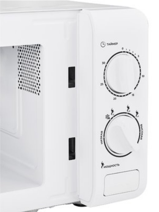Модель имеет классический минималистичный дизайн. На корпусе всего два поворотных переключателя. Один из них регулирует мощность нагрева, а другой позволяет установить время работы микроволновой печи. Выполнена СВЧ в белом цвете.