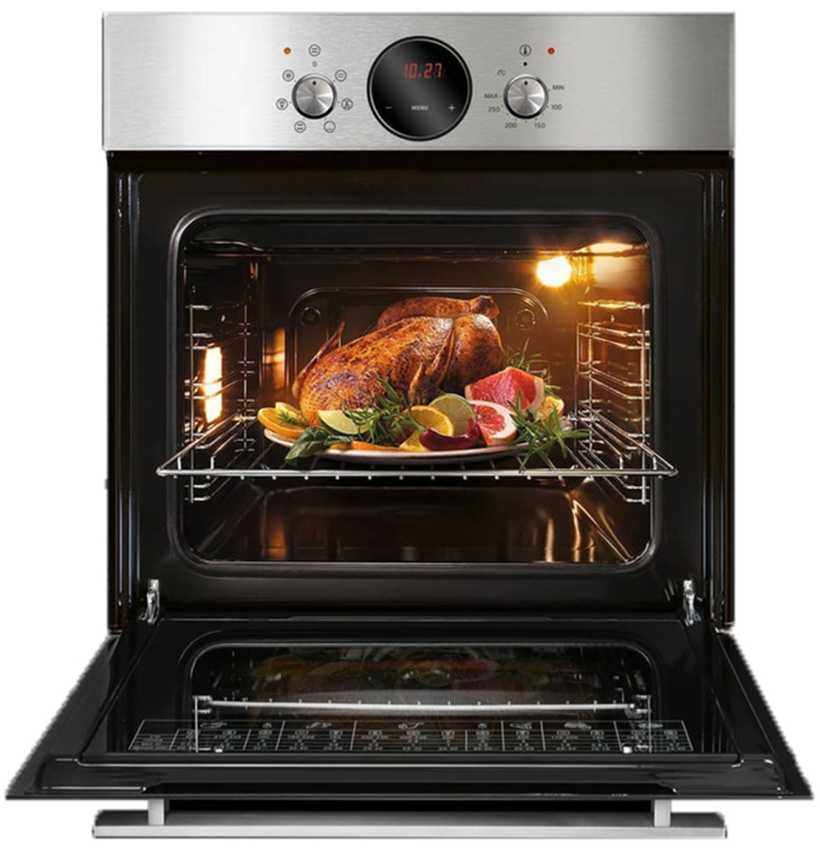 Электрический духовой шкаф с фасадом из нержавеющей стали. Классический дизайн и механическое управление с утапливаемыми поворотными переключателями, дополнено сенсорным таймером. Посередине верхней панели расположен циферблат с цветным дисплеем. Классический нагрев с автоматическим поддержанием заданной температуры дополнен конвектором. Конвекция ускоряет нагрев, равномерно распределяет жар по всему полезному объему жарочного шкафа и позволяет готовить на нескольких уровнях одновременно. В комплектации также усиленный гриль, съемный вертел. Многофункциональность духового шкафа открывает практические неограниченные возможности в готовке, а удобство использования упрощает ежедневный кулинарный труд. Направляющие для противней выполнены съемными, а сама духовка с двухточечной подсветкой.Размеры монтажного проема Гефест ДА 602-02 РН7 - 55x54x57 см (ШхГхВ), сетевой шнур и вилка в наличии.Ключевые преимущества: Утапливаемые ручки управления; Таймер сенсорный; Усиленный гриль с конвекцией; Вертел с электроприводом; Подсветка духовки двойная; Съемные проволочные направляющие духовки.