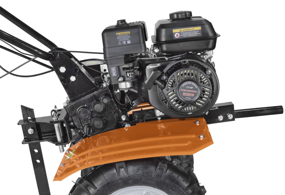 Мотоблок бензиновый Carver MT-70 обладает надежной конструкцией и позволяет проводить многочисленные сельскохозяйственные работы. Он оборудован большими пневматическими колесами, которые обеспечивают хорошую проходимость по неровному ландшафту. Для регулировки глубины вспашки до 35 см используется сошник. Цельный стальной лист согнут для выполнения кронштейна сошника. Это делает его прочным и стойким к коррозии.