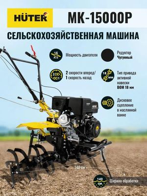 Сельскохозяйственная машина Huter MK-15000P используется для обработки почвы - рыхления, боронования, выравнивания, прополки и других работ на приусадебных, огородных и садовых участках. Агрегат имеет бензиновый двигатель мощностью 15 лошадиных сил и три передачи, две вперед и одну назад. Для удобства оператора все переключатели находятся на ручках агрегата, а резиновые накладки обеспечивают удобное удержание. Металлический щиток предотвращает попадание грунта на оператора и двигатель. Ширина обработки 140 сантиметров вместе с топливным баком в 3 литров позволяют обрабатывать большие территории без дозаправки.