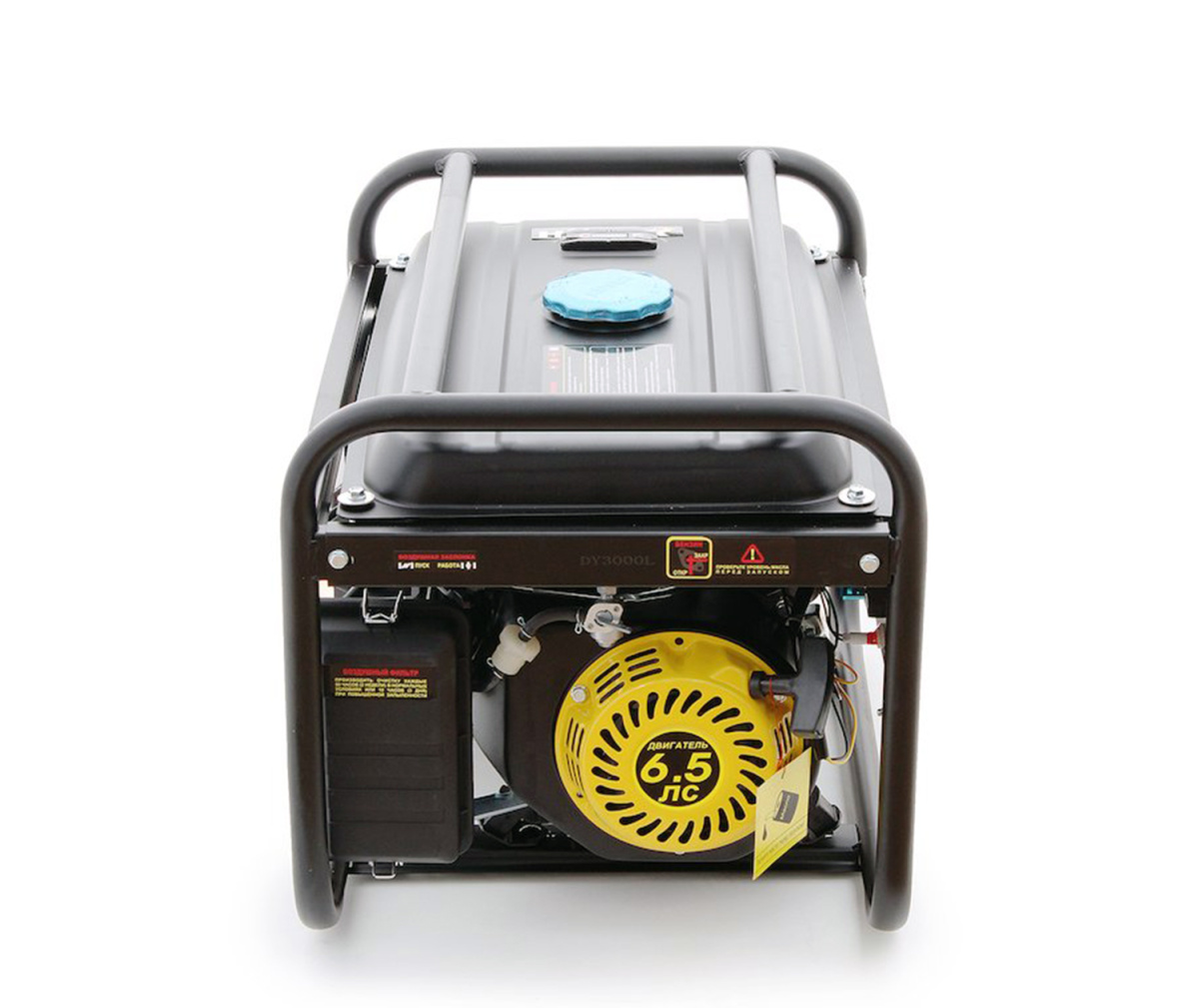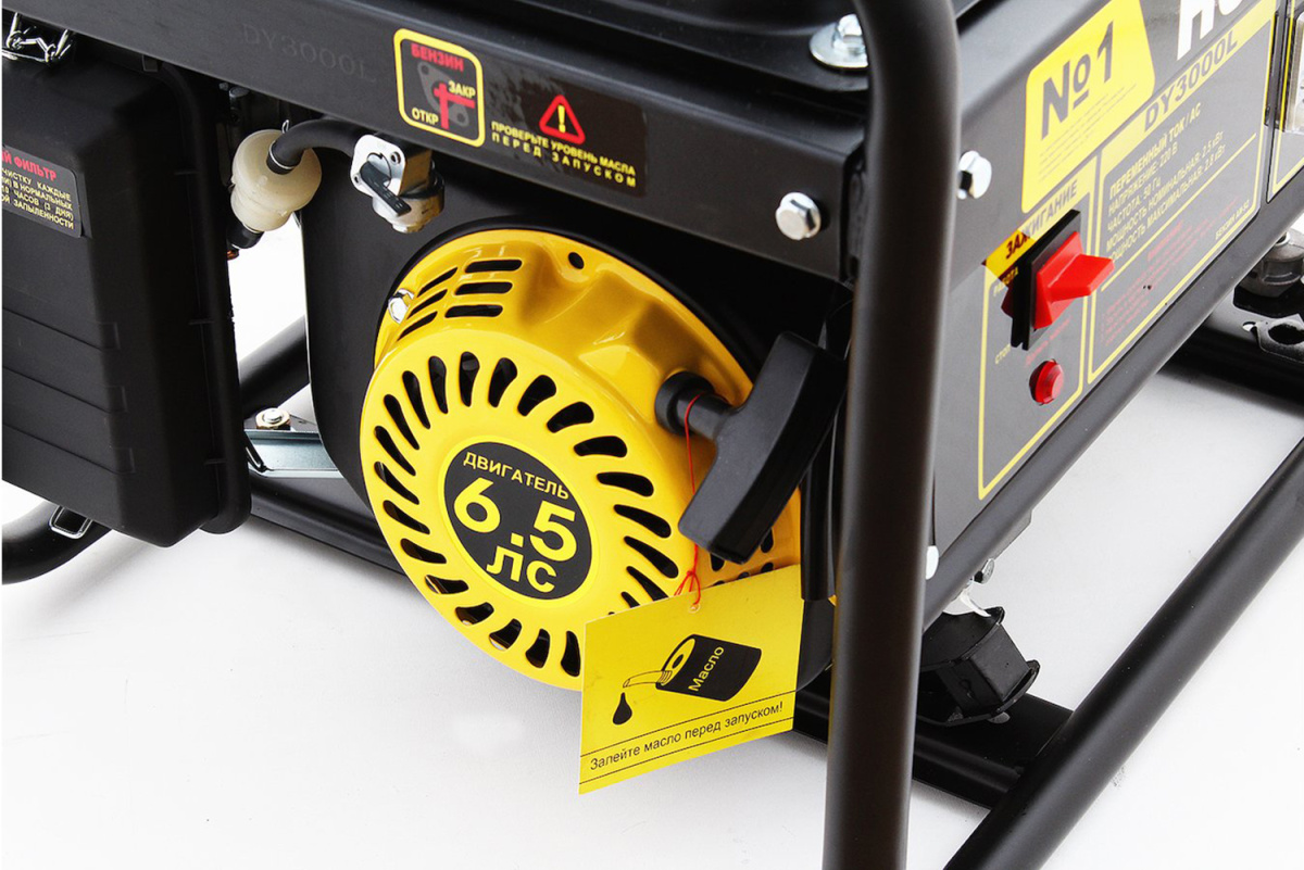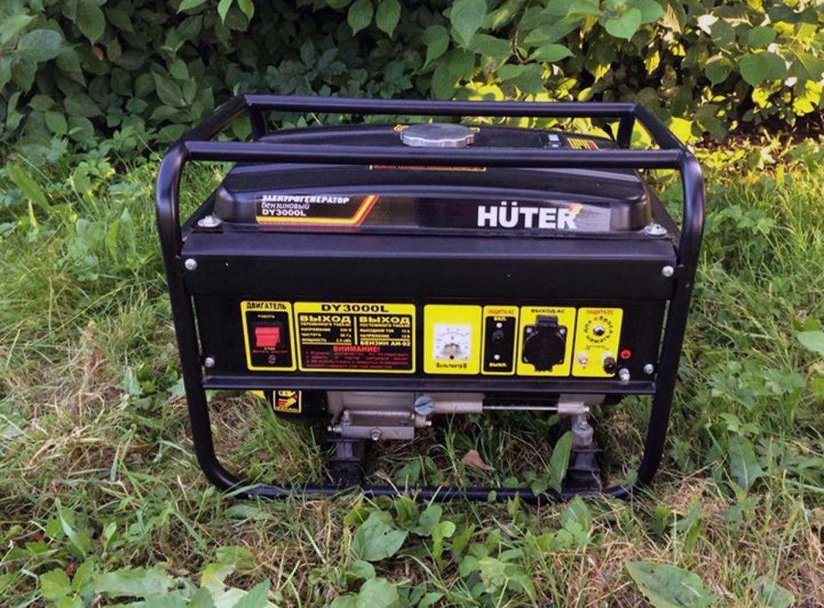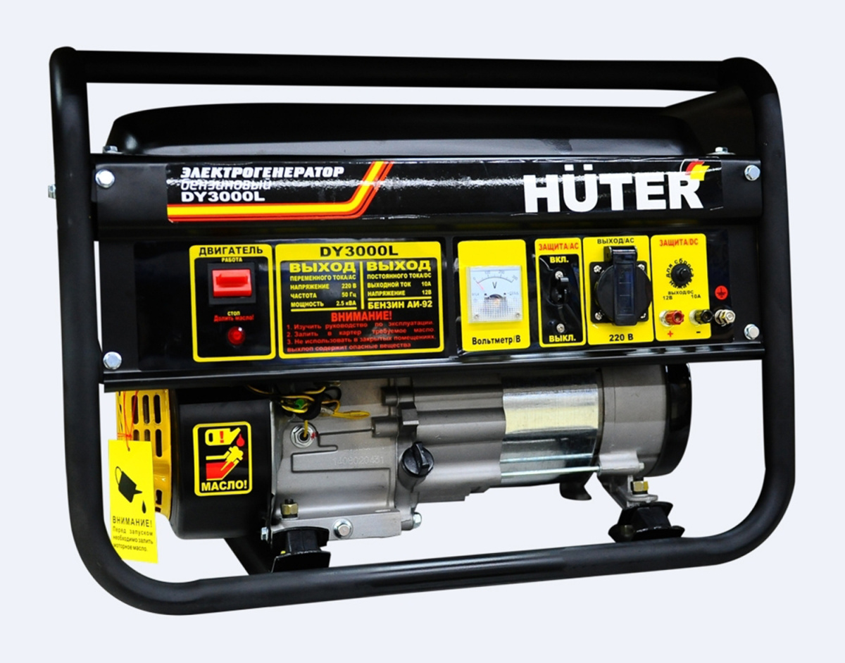 Huter DY3000L – бензиновый электрогенератор с двигателем внутреннего сгорания, предназначенный для автономного электроснабжения бытовых и хозяйственных переносных агрегатов. Особенно полезен генератор будет в качестве резервного источника питания на даче, при проведении строительных работ на открытом воздухе или в гараже, в экспедиции или длительном походе. Работает DY3000L на бензине АИ-92, располагает бензобаком объемом около 12 литров, в час расходуя в среднем 1,3 л. Таким образом, ресурсов генератора вам хватит примерно на 9-10 часов непрерывной работы.Помимо бензина, агрегат может работать и на бытовом сжиженном баллонном газе: пропане или пропан-бутане, при условии обязательной установки газовой системы питания.