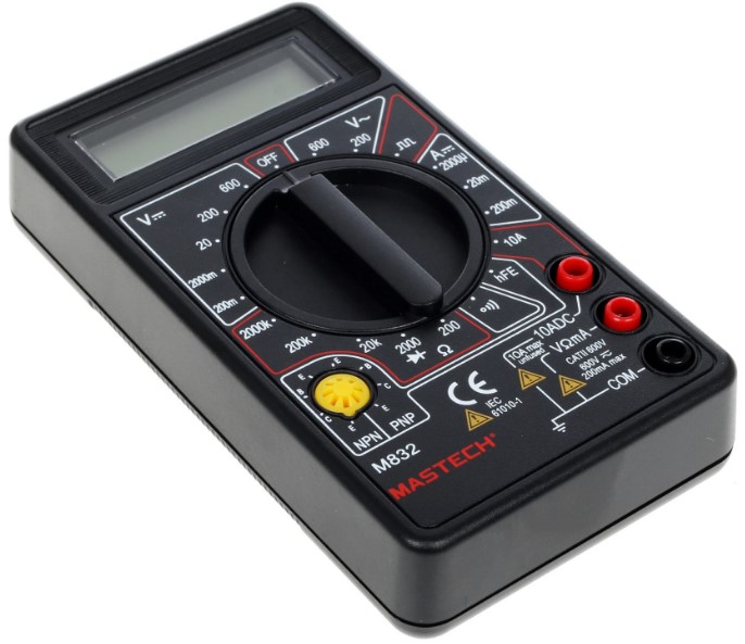 Мультиметр Mastech M832 — цифровой прибор, который позволяет измерять величины силы постоянного и переменного тока, постоянного и переменного напряжения, сопротивления, коэффициента усиления биполярных транзисторов