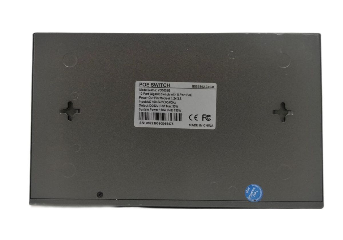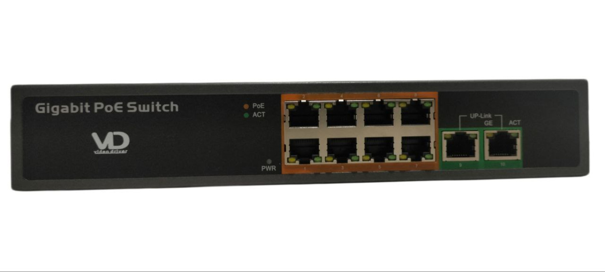 Неуправляемый PoE-коммутатор на 10 портов (8 PoE-портов и 2 uplink-порта) предназначен для передачи информационных электрических сигналов и PoE-питания по стандартам IEEE 802.3 af/at. Устройство оснащено светодиодной индикацией состояний каналов (соединение, активность сети, активность PoE). Подача питания осуществляется по типу А (1,2 : DC+; 3,6 : DC-).