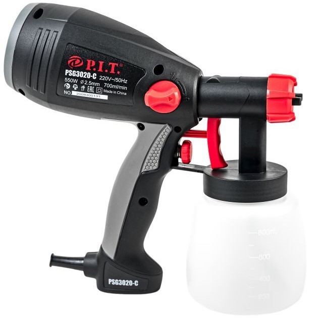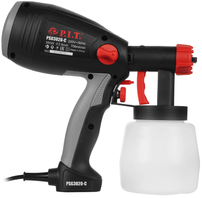 Электрический воздушный краскораспылитель P.I.T. МАСТЕР PSG3020-C оснащен пластиковым баком на 800 мл, прорезиненной рукояткой с удобным переключателем спускового крючка, медным соплом с диаметром 2.5 мм. Прибор действует от стандартной электросети с мощностью 550 Вт. Производительность системы составляет 700 г/мин.