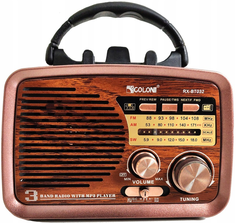 Радиоприемник Golon RX-BT032 - это современное музыкальное устройство в ретро-стиле, предназначенное для приема радиосигналов различных диапазонов и воспроизведения звука через встроенные динамики или подключенные наушники или аудиосистему.